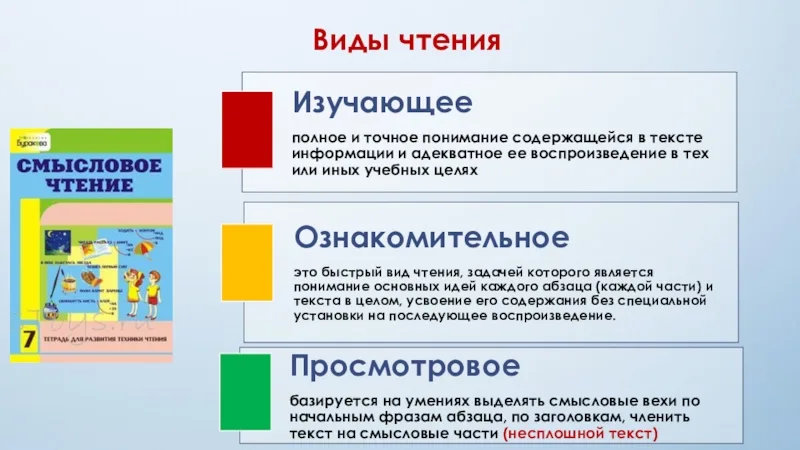 2. Существуют различные классификации видов чтения по различным признакам. Основные виды чтения,
